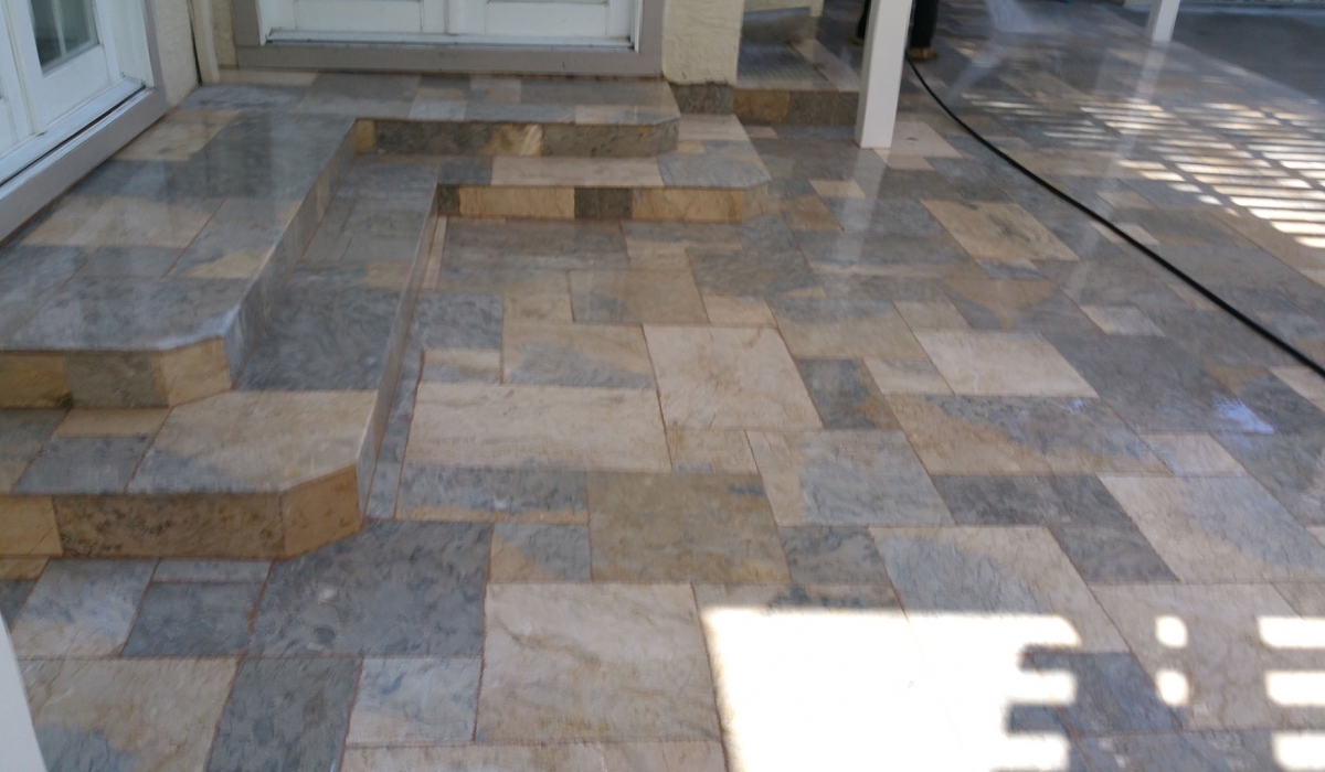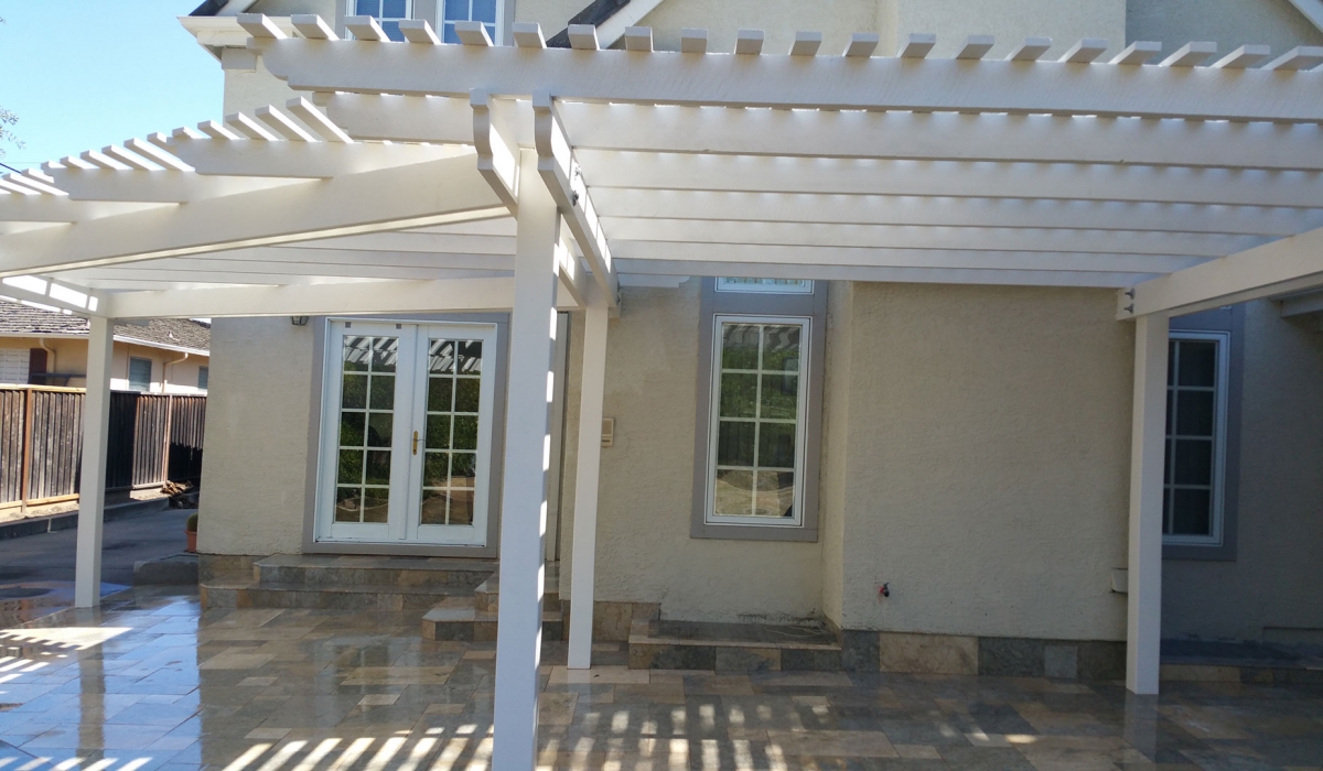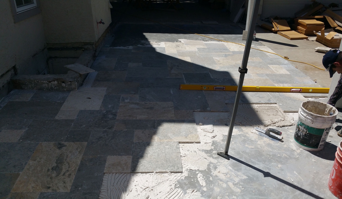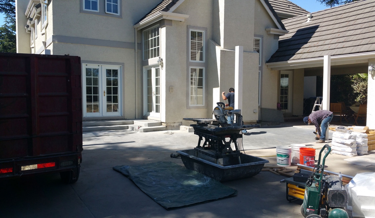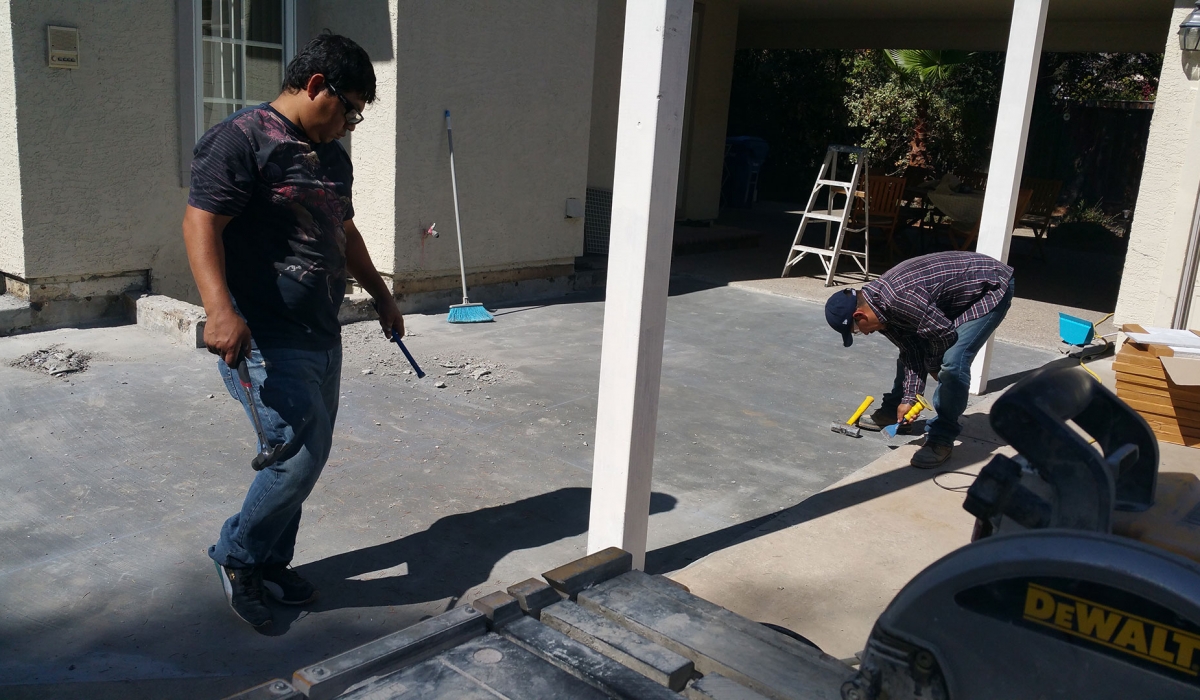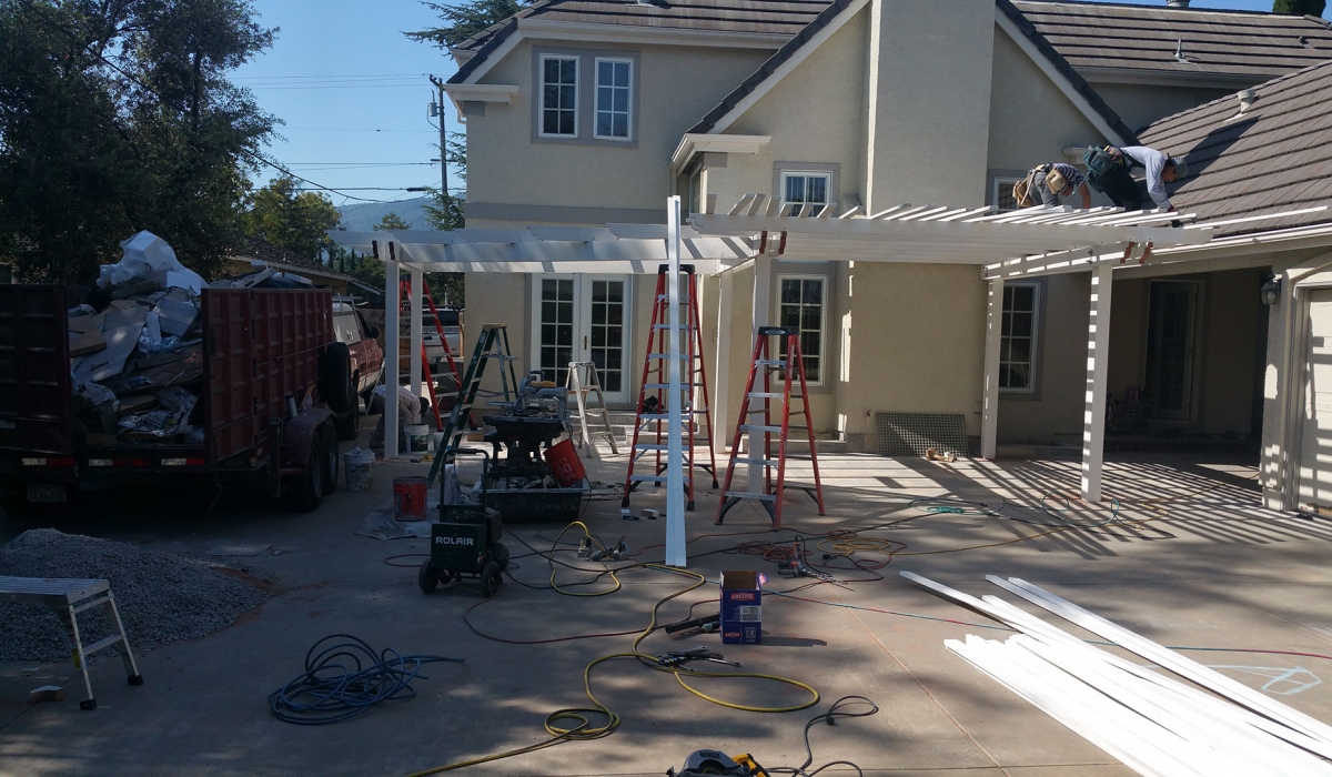 This project we did also last year. We remove an old high concrete pad. We reinstalled concrete with steps and installed gray travertine. We installed a pergola as well.