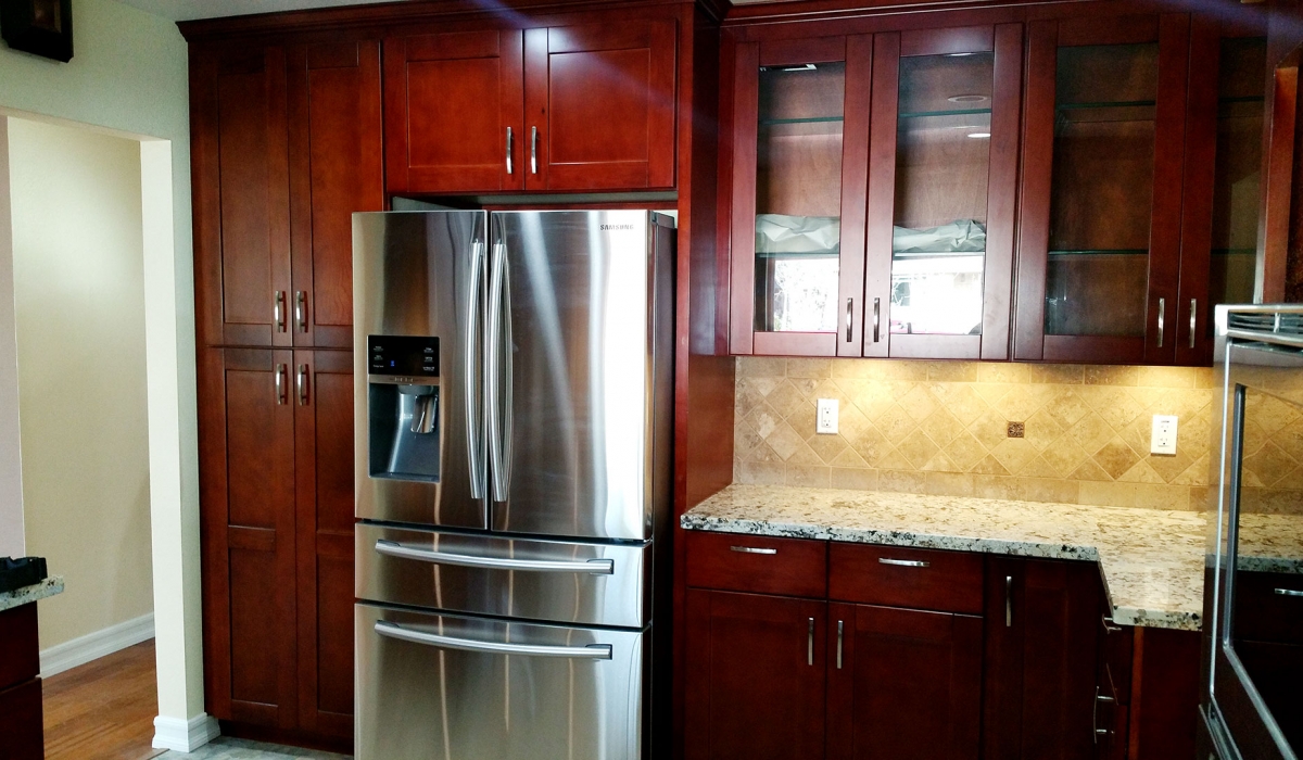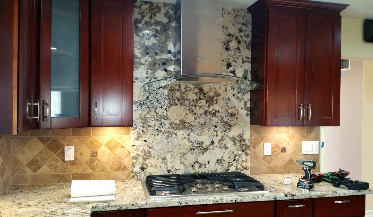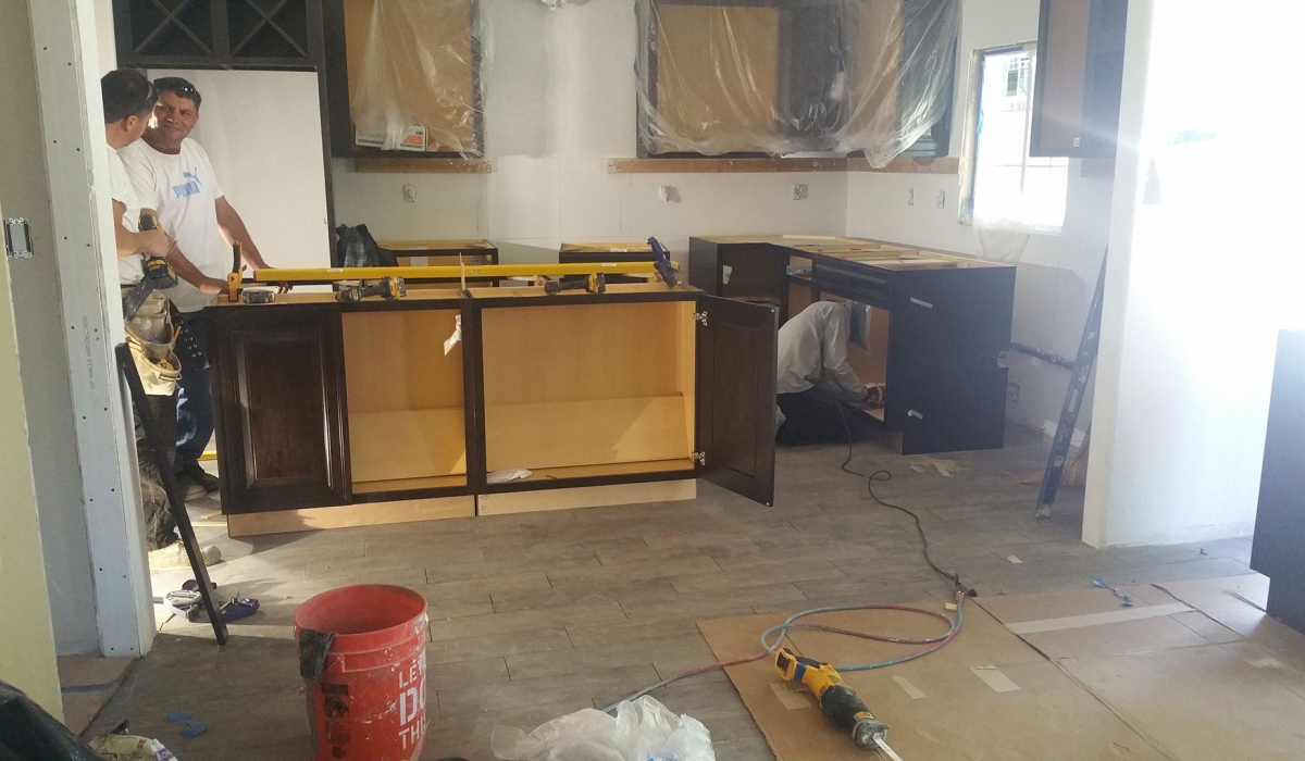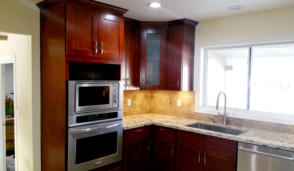 This is a kitchen that we remodeled last year. It used to be three separate rooms that were previously a the kitchen, living room and dining area. We removed all the walls by installing a couple of beams and created an “open look” concept. This is really nice because, in a house, most of the time is spent either in kitchen or in living room. Jointing both of these rooms make it feel like everyone is part of the action. People are able to enjoy or see what is going on in the next room. We did foundation work, framing, floor tiling, plumbing, electrical, drywall, painting, cabinet installation and all of the finish work.