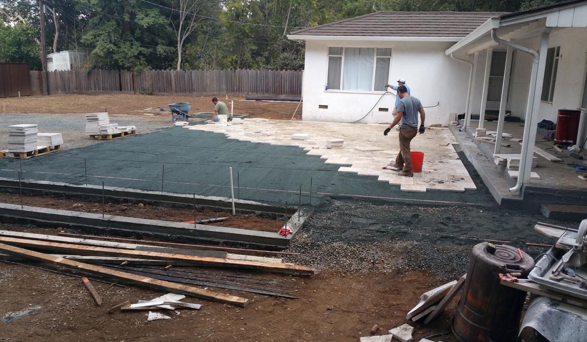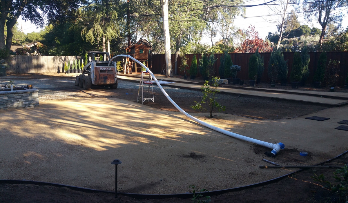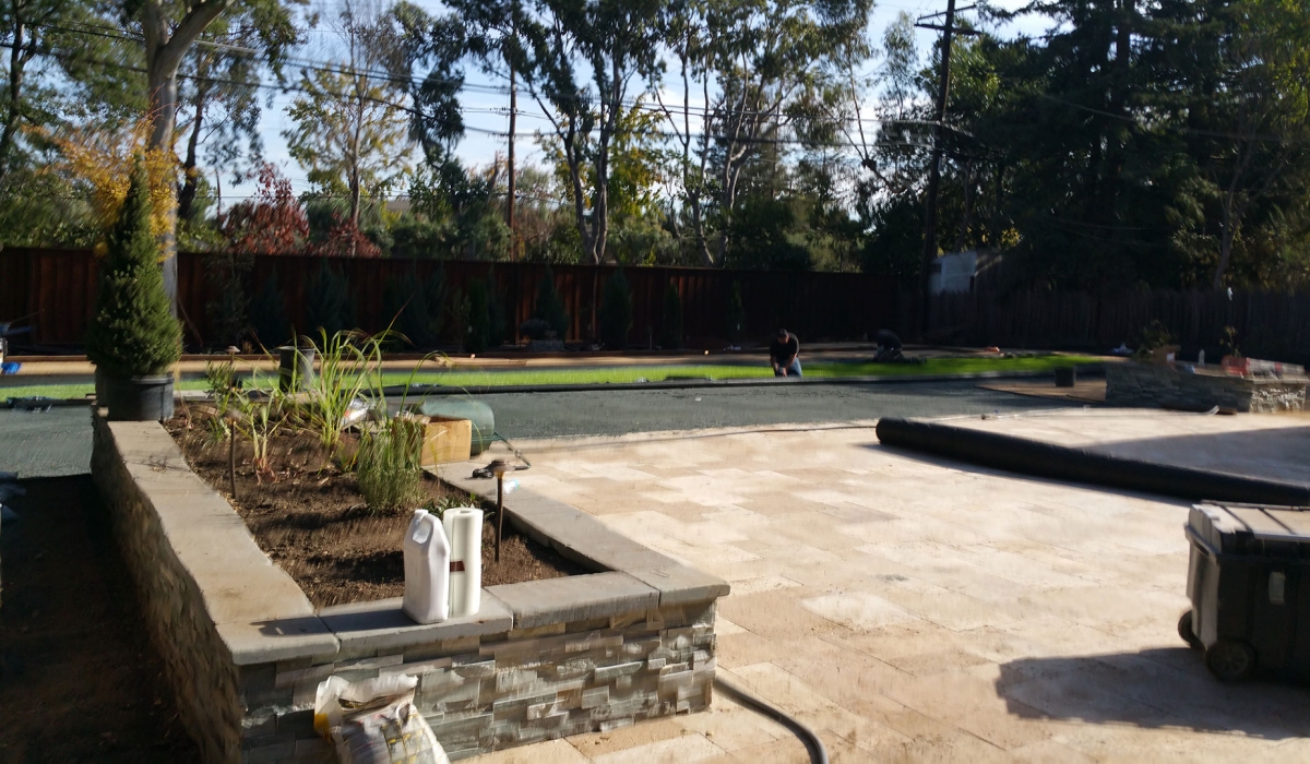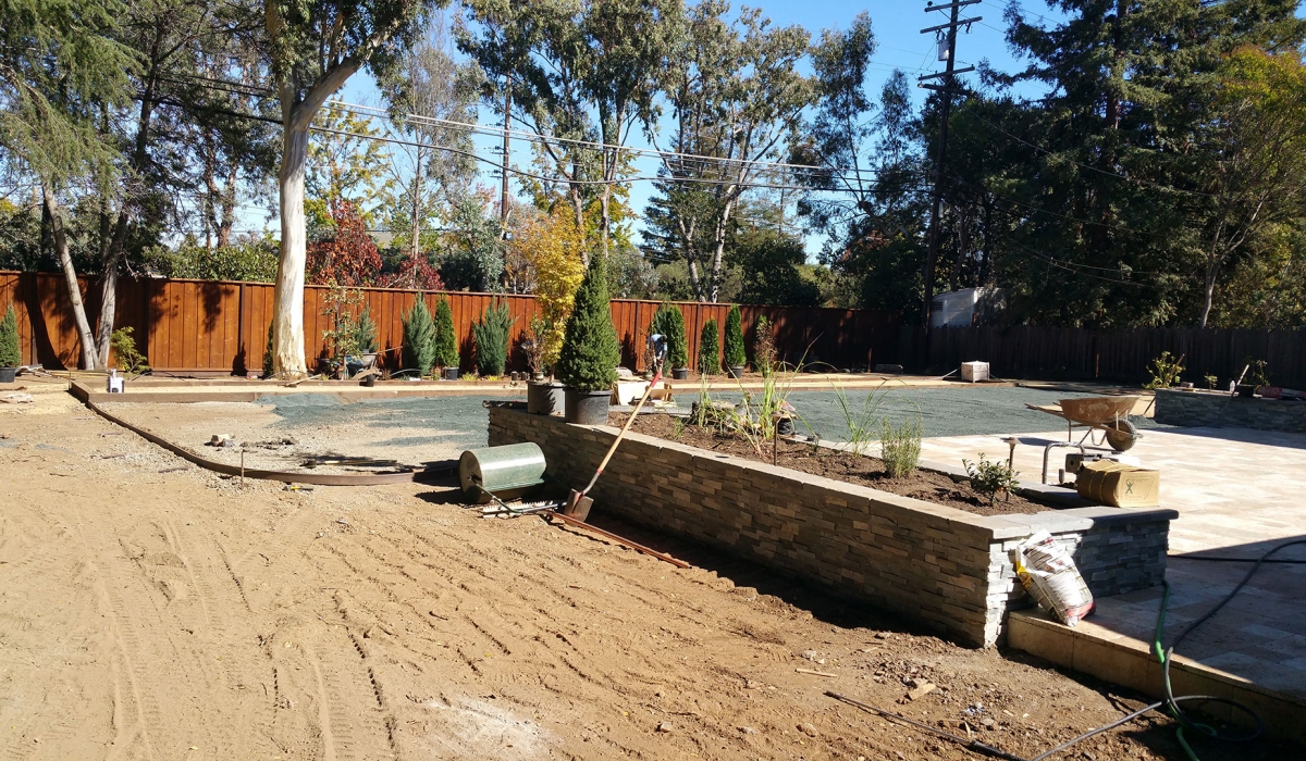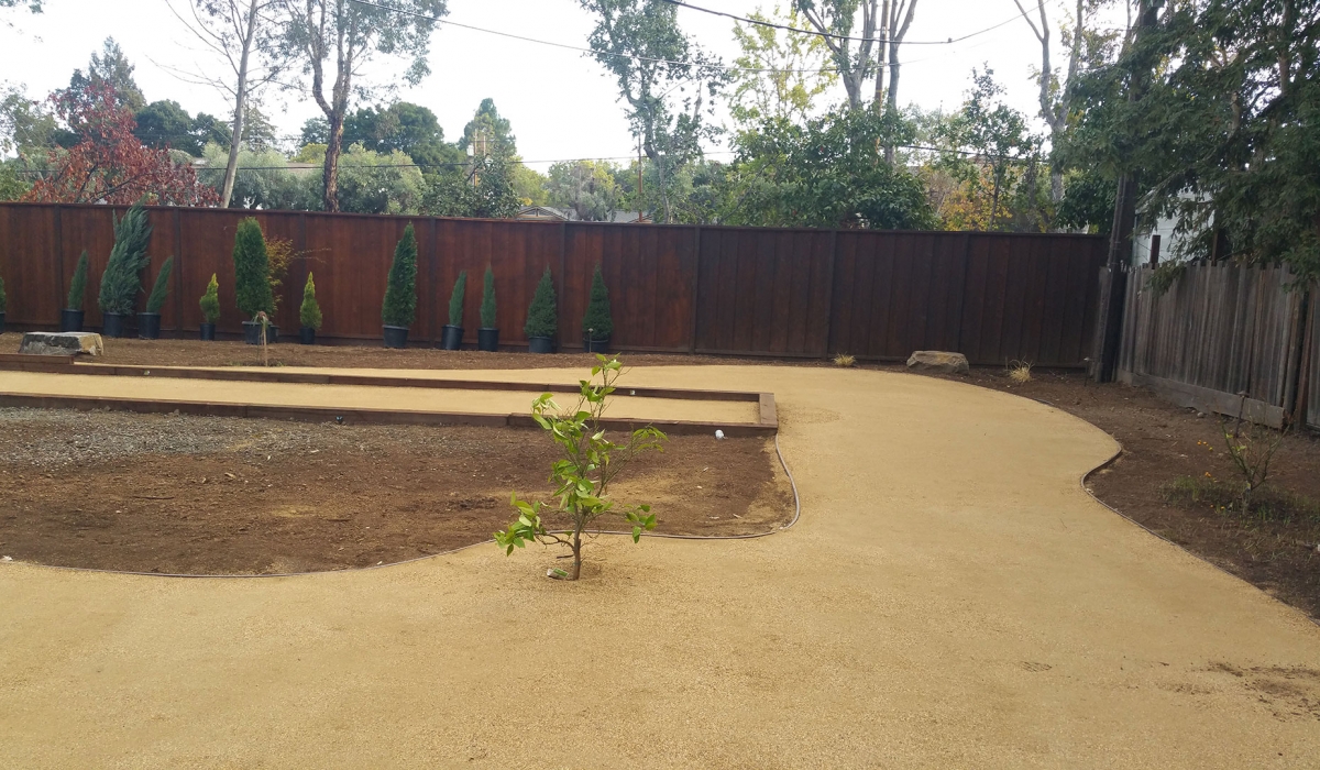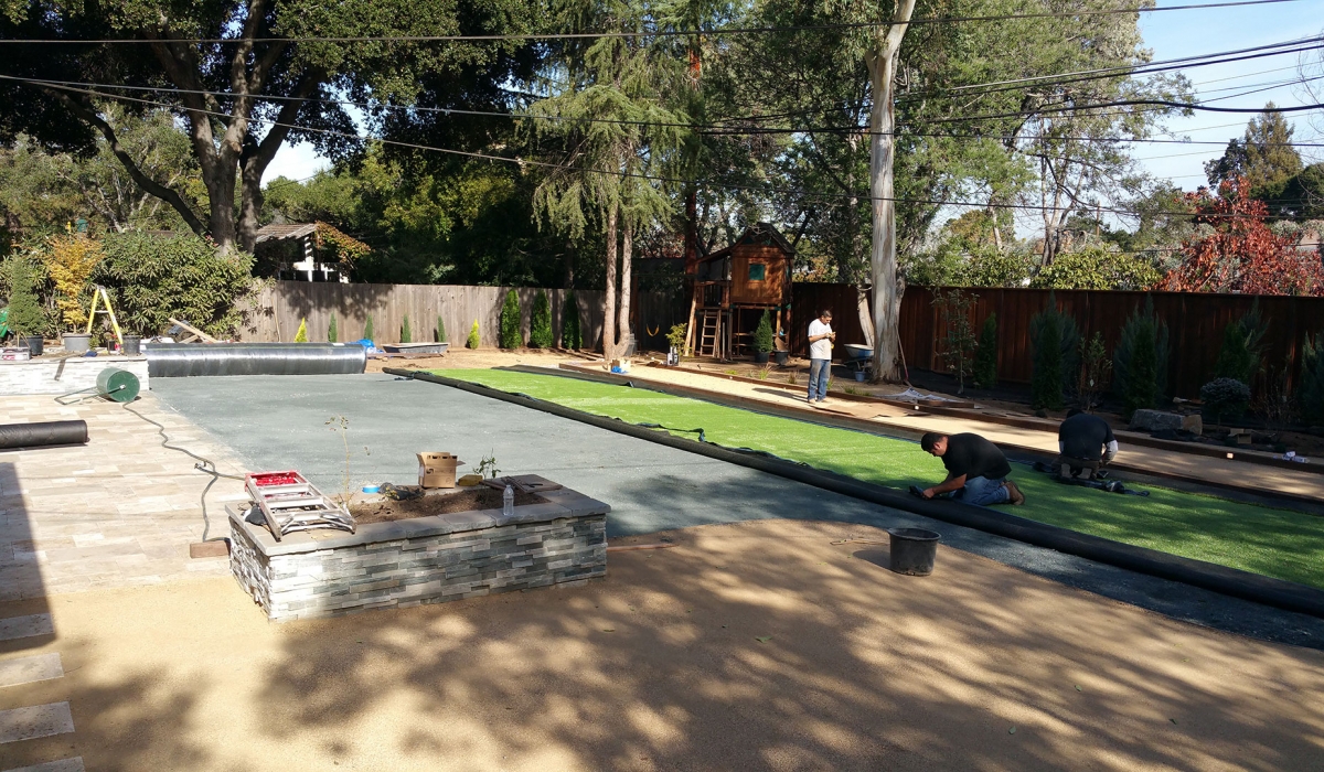 This is a big landscape job that we did in Los Altos last year. There was a pool that was filled in. There is a bocce court. There is a artificial sod area. A lot of decomposed granite (DG). Two huge stone planters. Two big vegetable wood planters. Big travertine paver deck. We also did a french drain that naturally slopes to rear street.